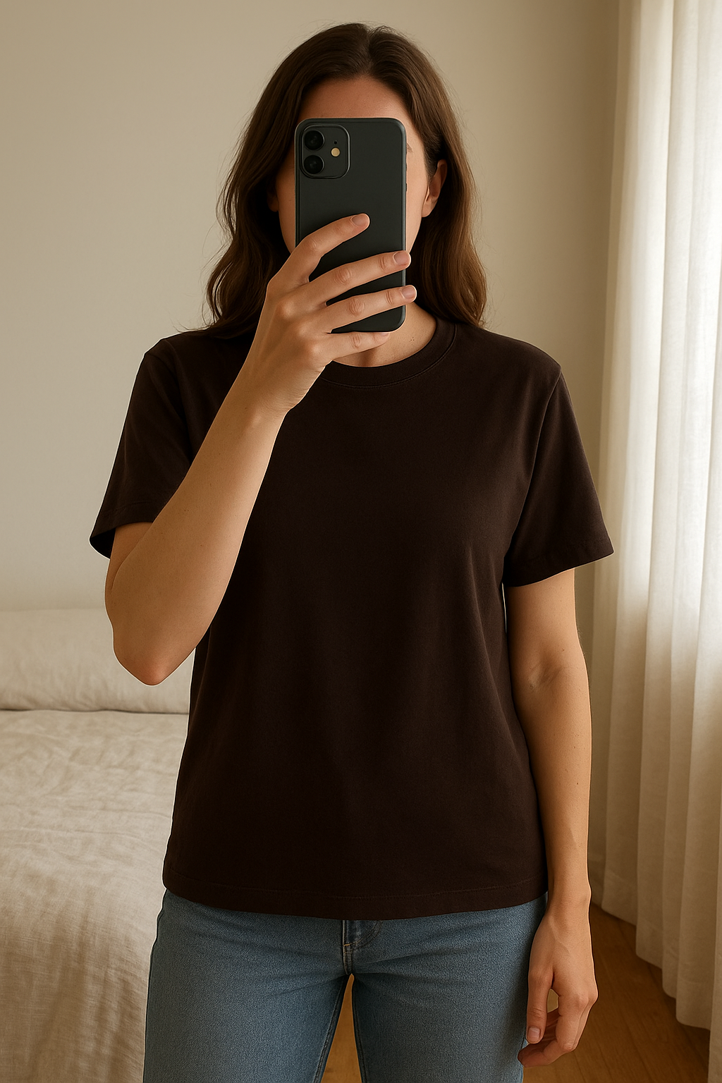 T-shirt épais marron L - Maglietta donna in piedi, rivolto verso la fotocamera, in una camera da letto con luce soffusa e luce naturale che filtra dalla finestra.