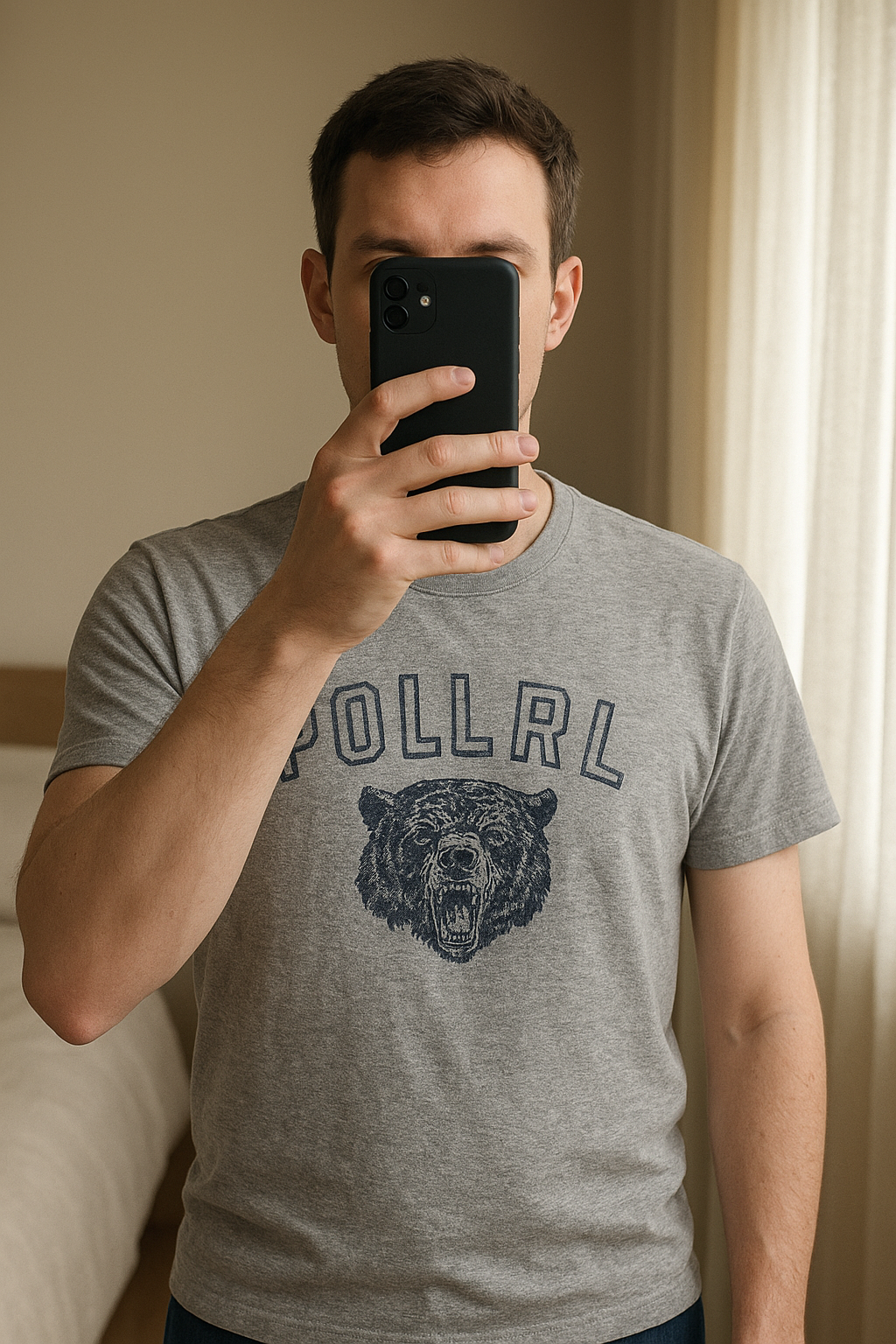 T-shirt polo Ralph Lauren debout, face à la caméra, dans une chambre à la lumière douce, avec une lumière naturelle filtrant par la fenêtre.
