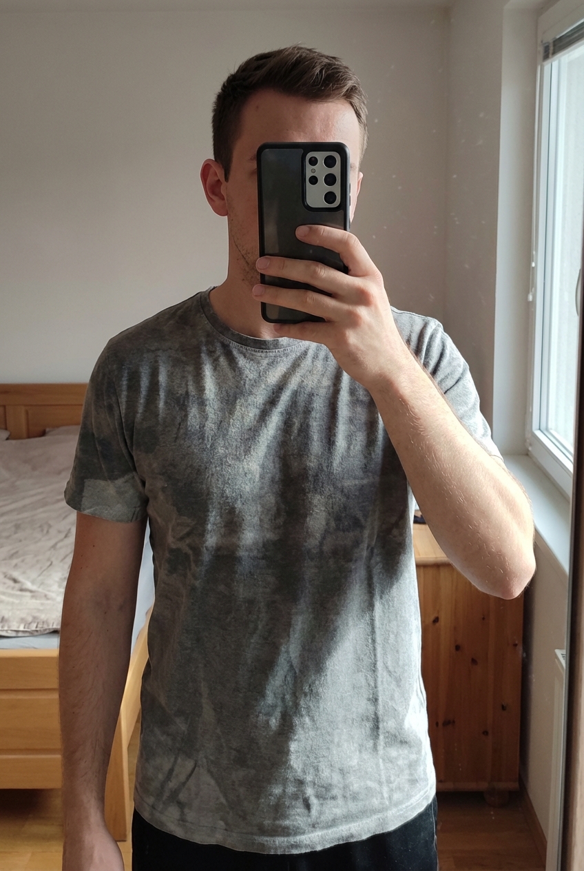 T shirt taille M CELIO debout, face à la caméra, dans une chambre à la lumière douce, avec une lumière naturelle filtrant par la fenêtre.