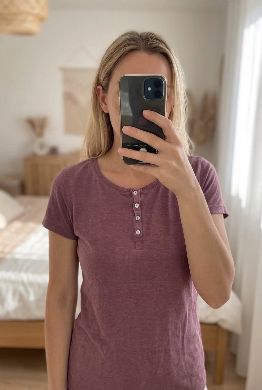 Tee shirt femme inextenso taille M debout, face à la caméra, dans une chambre à la lumière douce, avec une lumière naturelle filtrant par la fenêtre.