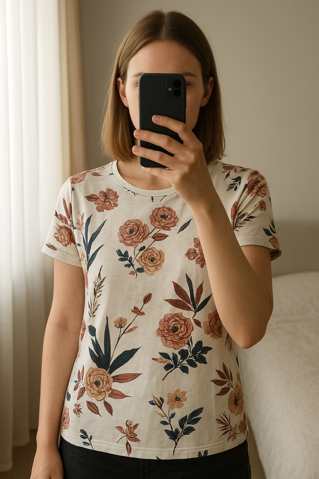 Tee-shirt Floral Imprimé Végétal & Libellules Vintage debout, face à la caméra, dans une chambre à la lumière douce, avec une lumière naturelle filtrant par la fenêtre.
