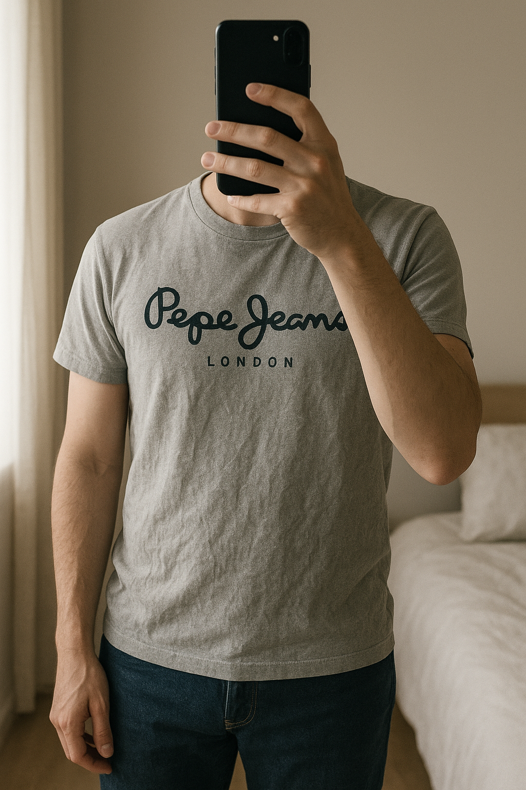 Tee-shirt gris homme Pepe Jeans taille L debout, face à la caméra, dans une chambre à la lumière douce, avec une lumière naturelle filtrant par la fenêtre.