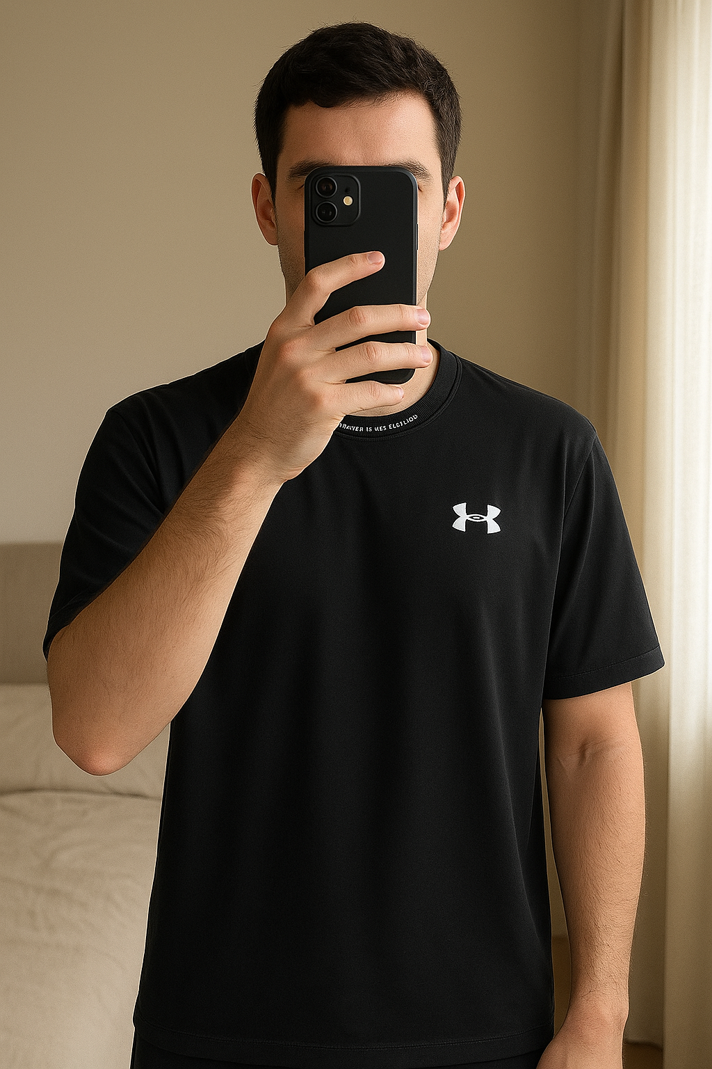 Tee shirt " Under Armour " noir : xxl debout, face à la caméra, dans une chambre à la lumière douce, avec une lumière naturelle filtrant par la fenêtre.