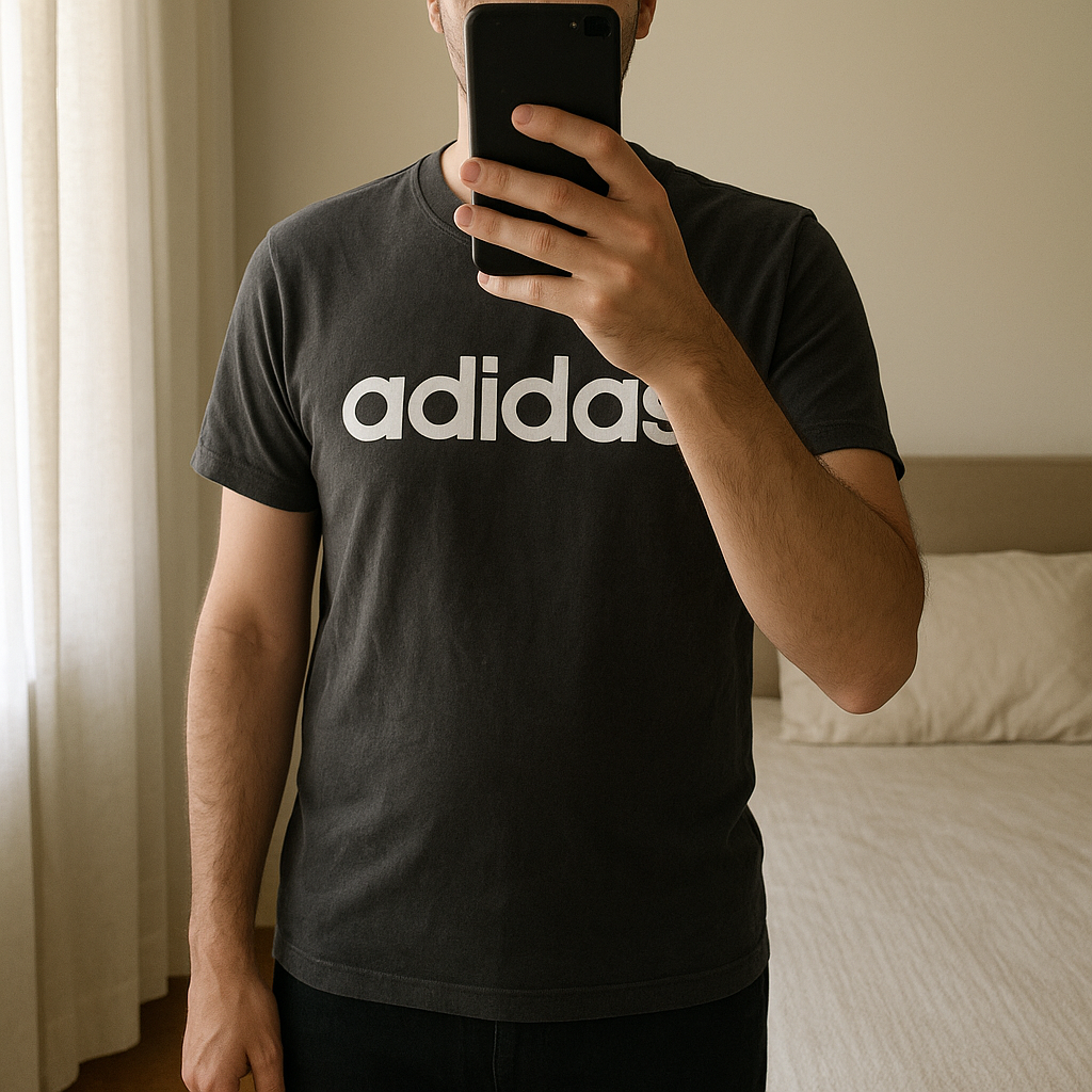 Tee-shirts adidas debout, face à la caméra, dans une chambre à la lumière douce, avec une lumière naturelle filtrant par la fenêtre.