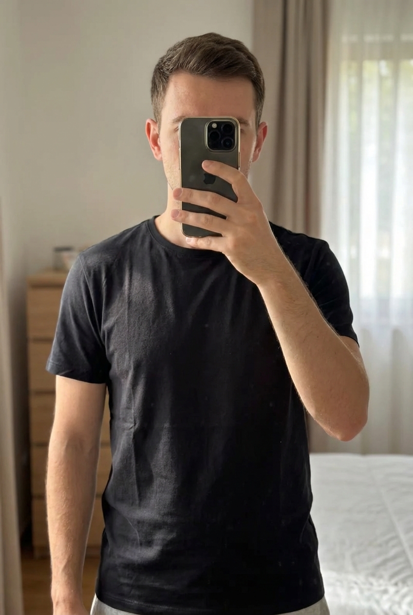 Teeshirt Kiabi homme M debout, face à la caméra, dans une chambre à la lumière douce, avec une lumière naturelle filtrant par la fenêtre.