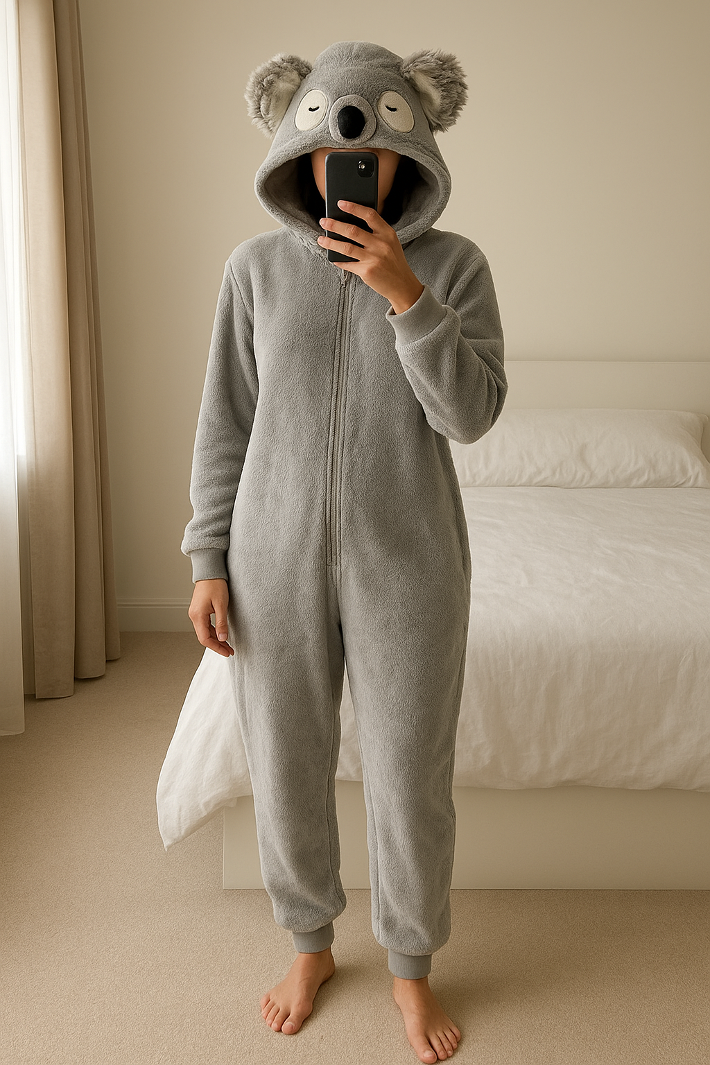 Toller Kuschel Onsie / Overall von Verbaudet aufrecht stehend, der Kamera zugewandt, in einem sanft beleuchteten Schlafzimmer, mit natürlichem Licht, das durch ein Fenster fällt.