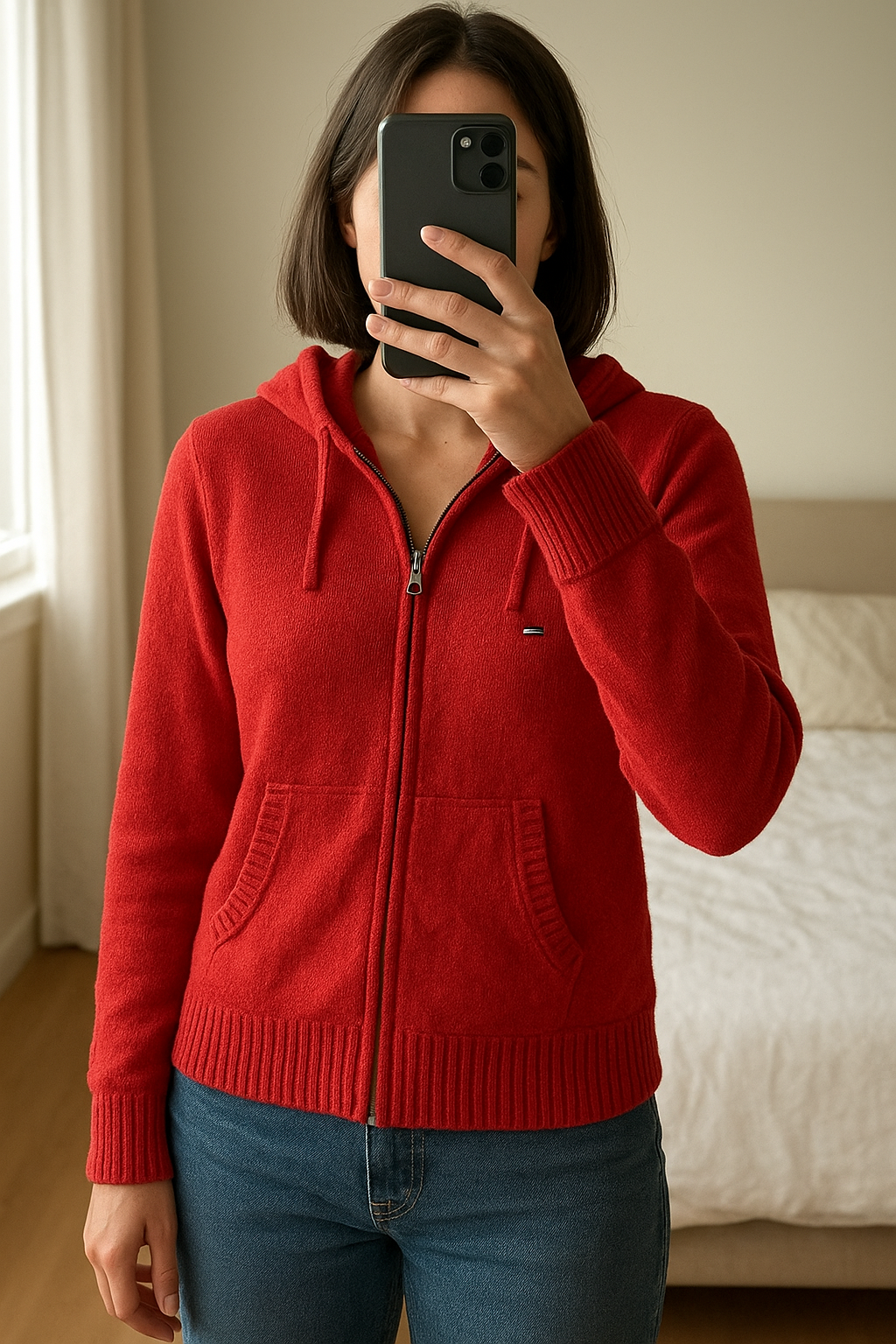 Tommy Hilfiger zip up jumpers de pie, mirando a la cámara, en un dormitorio con luz suave y natural filtrándose por la ventana.