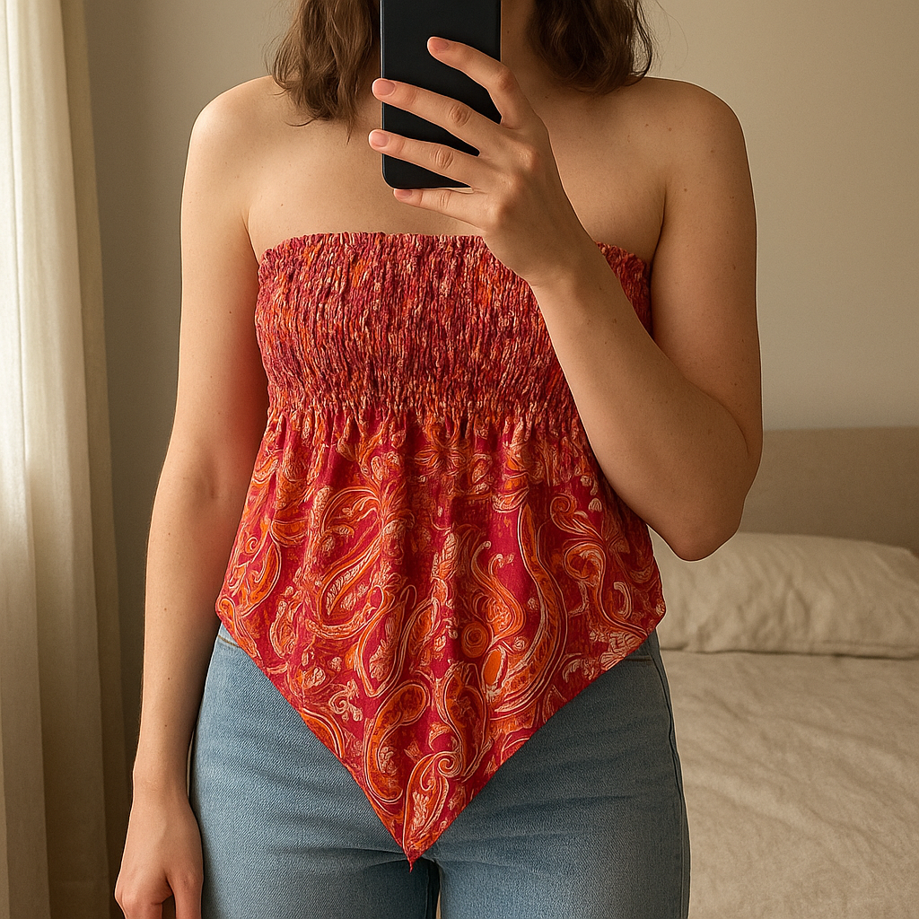 Top bandeau debout, face à la caméra, dans une chambre à la lumière douce, avec une lumière naturelle filtrant par la fenêtre.