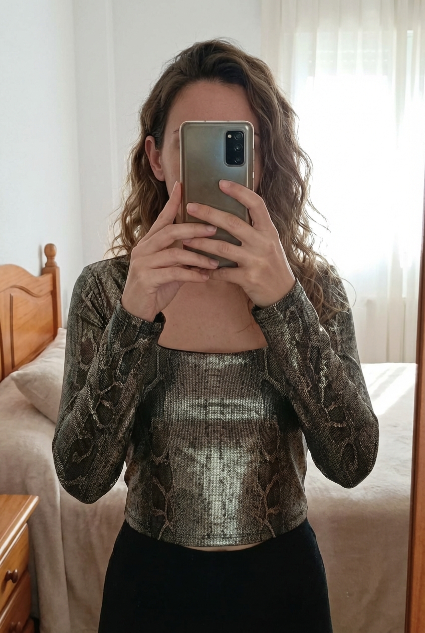 Top Bershka serpiente de pie, mirando a la cámara, en un dormitorio con luz suave y natural filtrándose por la ventana.