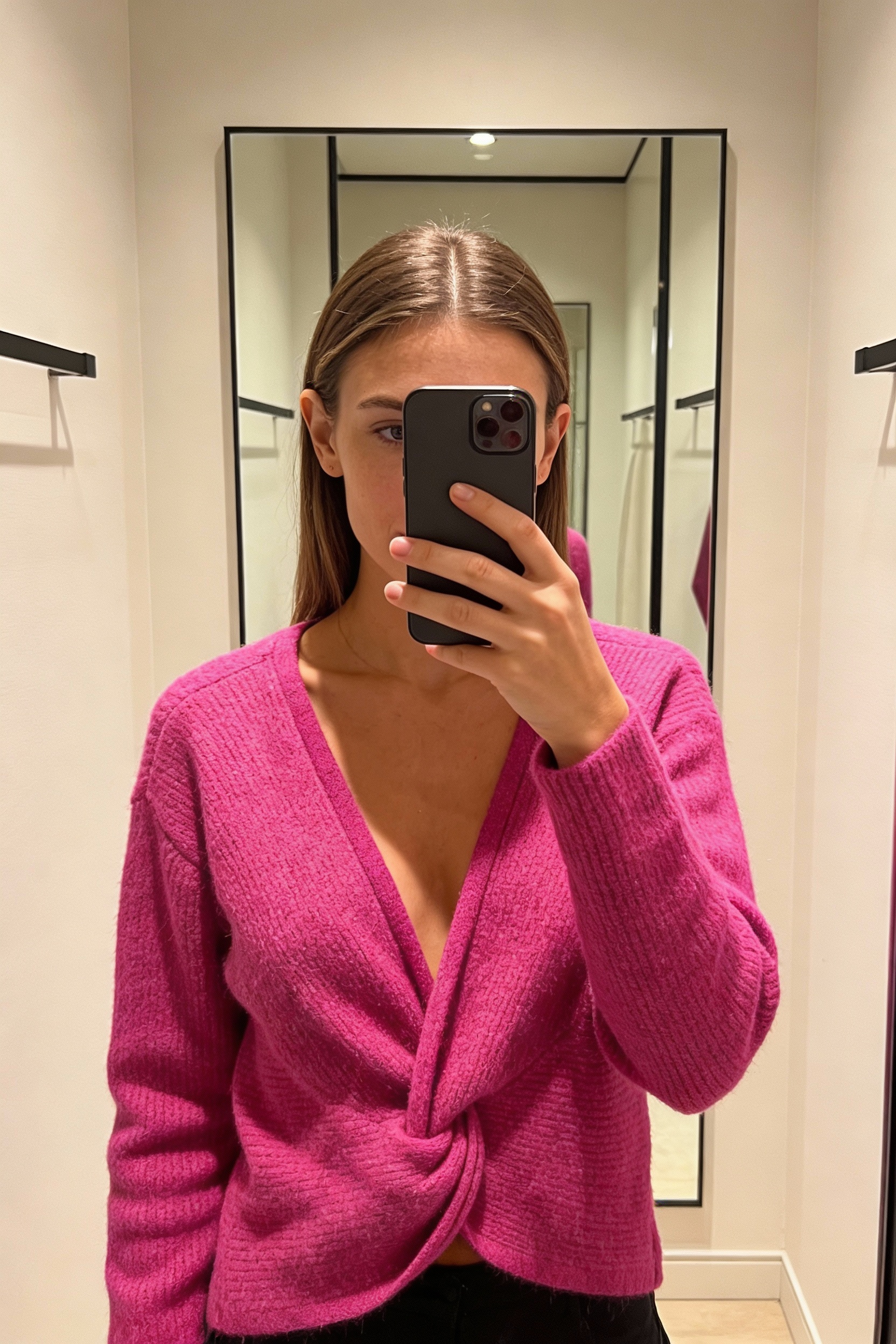 Une personne en Top blouse croisée réversible en laine et alpaga debout, face à la caméra, dans une cabine d’essayage de style boutique avec un miroir et une décoration neutre.