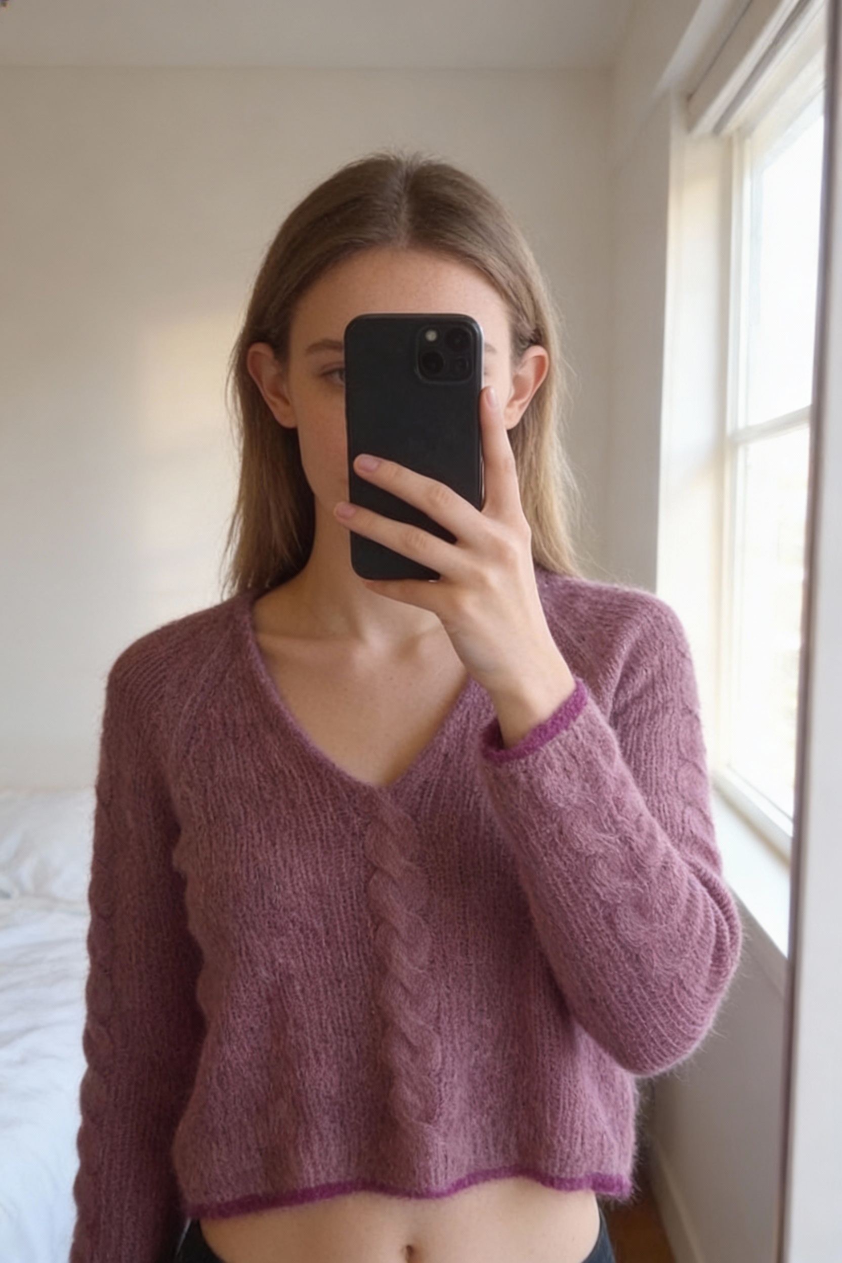 Une personne en Top blouse tricoté en mohair debout, face à la caméra, dans une chambre à la lumière douce, avec une lumière naturelle filtrant par la fenêtre.