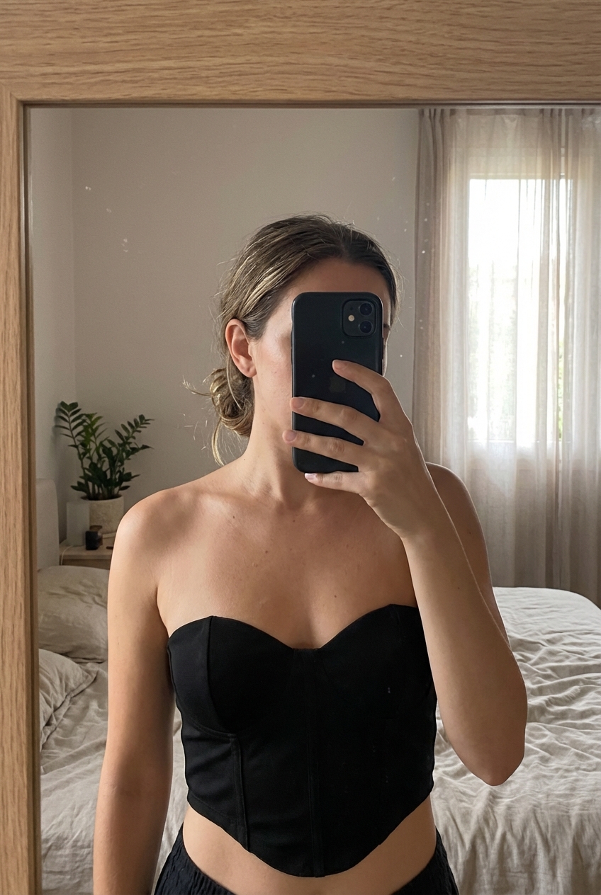 Top bustier noir shein debout, face à la caméra, dans une chambre à la lumière douce, avec une lumière naturelle filtrant par la fenêtre.