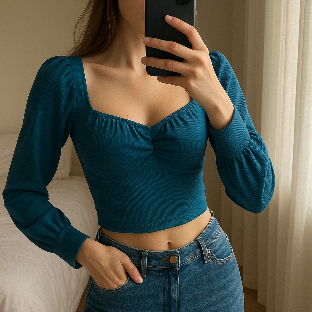 Una persona con Top corto azul arqueando ligeramente la espalda para una pose dinámica, con tipo de cuerpo delgado, en un dormitorio con luz suave y natural filtrándose por la ventana.