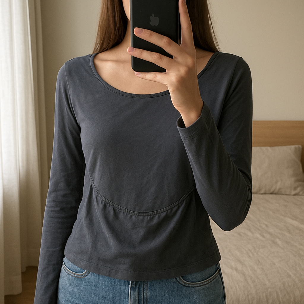 Top gris à manches longues – Taille M debout, face à la caméra, dans une chambre à la lumière douce, avec une lumière naturelle filtrant par la fenêtre.