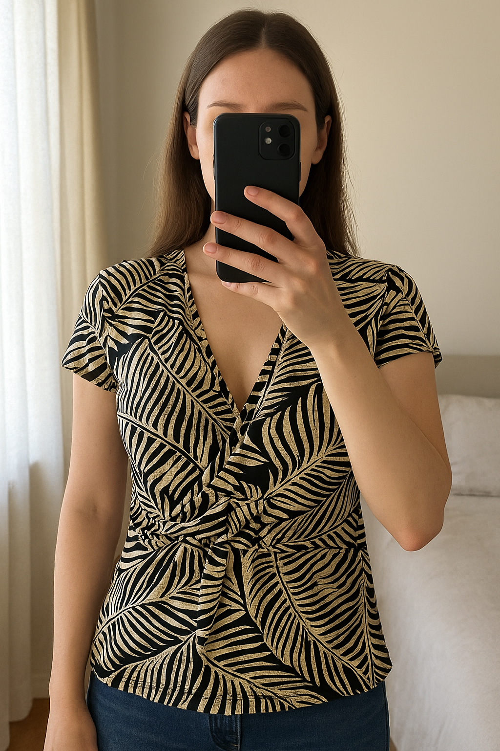 Top manches courtes morgan motif tropical avec décolleté en V, ample et épaulettes années 2000 debout, face à la caméra, dans une chambre à la lumière douce, avec une lumière naturelle filtrant par la fenêtre.
