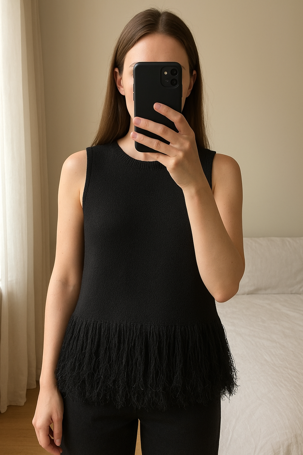 Top negro de punto de Country Road talla XS de pie, mirando a la cámara, en un dormitorio con luz suave y natural filtrándose por la ventana.