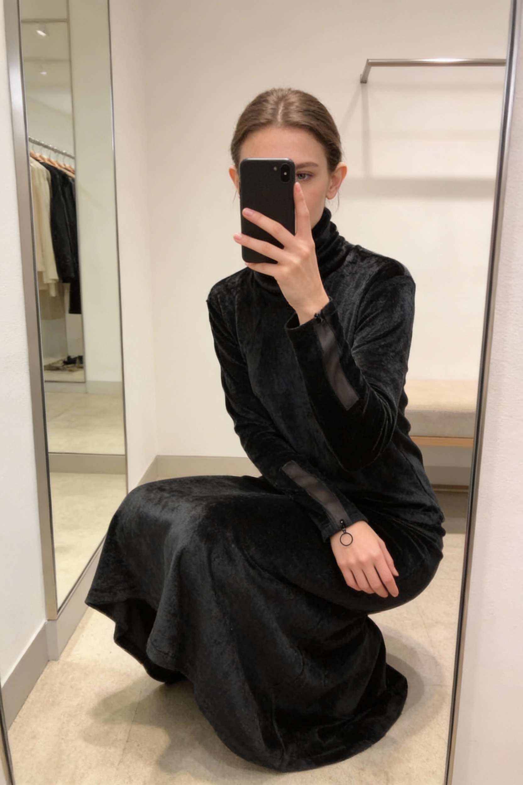 Une personne en Top velours darkwear accroupi élégamment pour montrer le tombé et le mouvement du vêtement, dans une cabine d’essayage de style boutique avec un miroir et une décoration neutre.