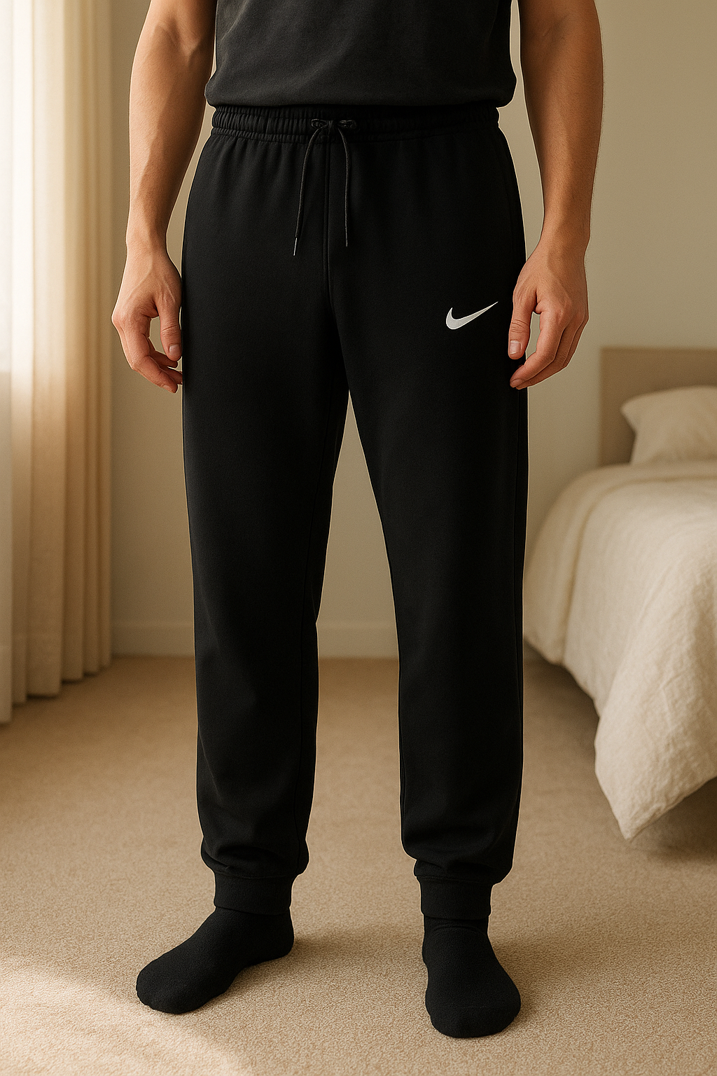 Training Nike debout, face à la caméra, dans une chambre à la lumière douce, avec une lumière naturelle filtrant par la fenêtre.