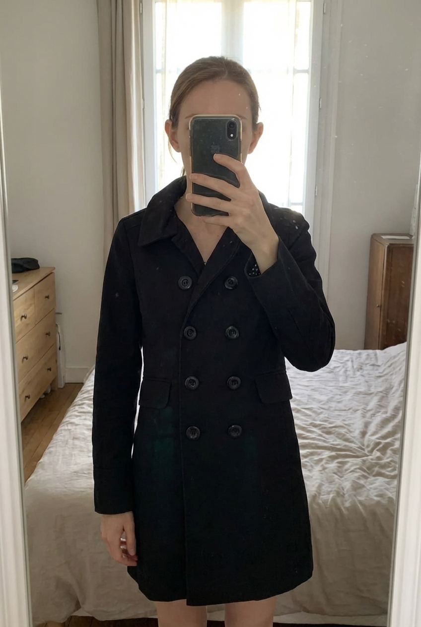 Une personne en Trench / manteau femme debout, face à la caméra, avec une silhouette fine, dans une chambre à la lumière douce, avec une lumière naturelle filtrant par la fenêtre.