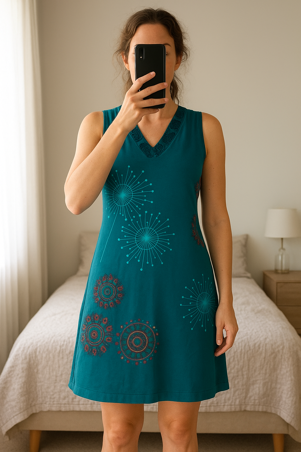 Tunique robe femme ethnique bleue sans manches 38 debout, face à la caméra, dans une chambre à la lumière douce, avec une lumière naturelle filtrant par la fenêtre.