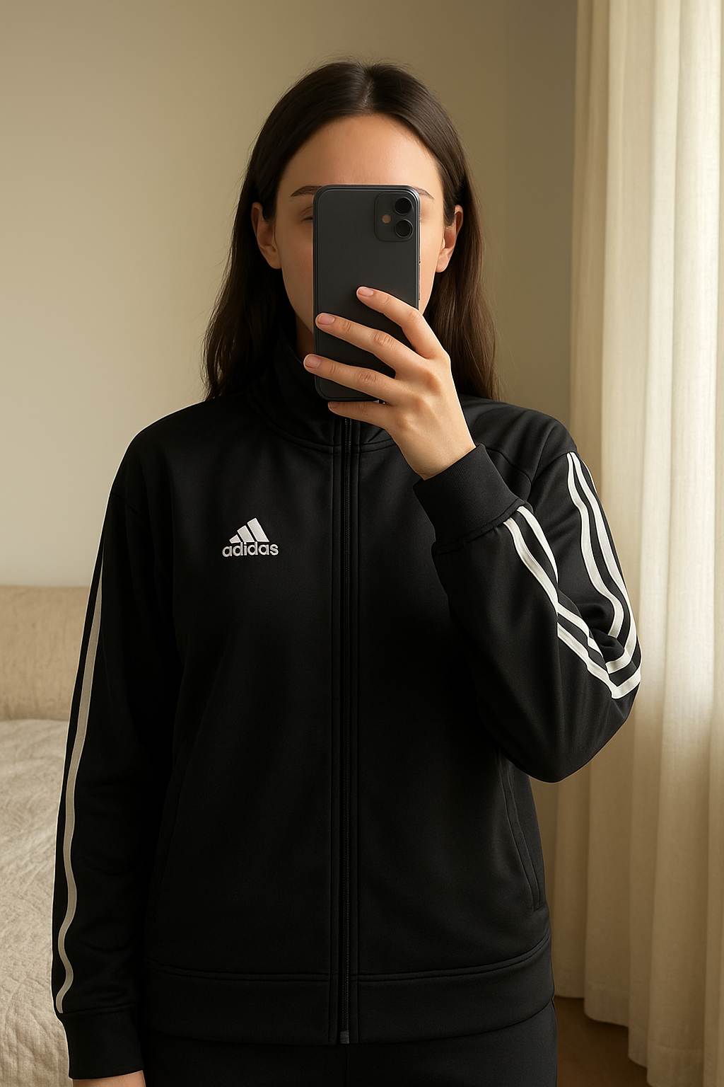 Veste ADIDAS noir, taille L debout, face à la caméra, dans une chambre à la lumière douce, avec une lumière naturelle filtrant par la fenêtre.