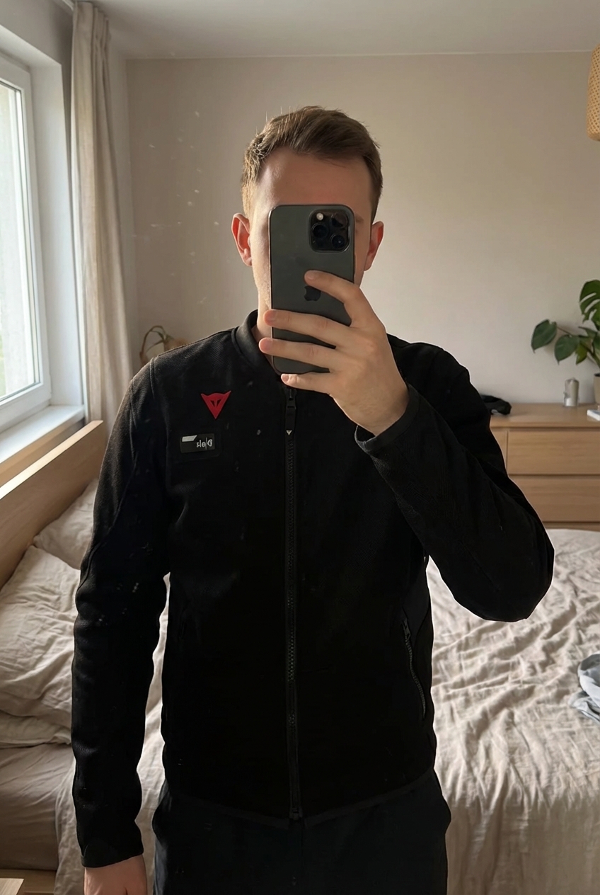 Veste airbah dainese smart jacket les debout, face à la caméra, dans une chambre à la lumière douce, avec une lumière naturelle filtrant par la fenêtre.