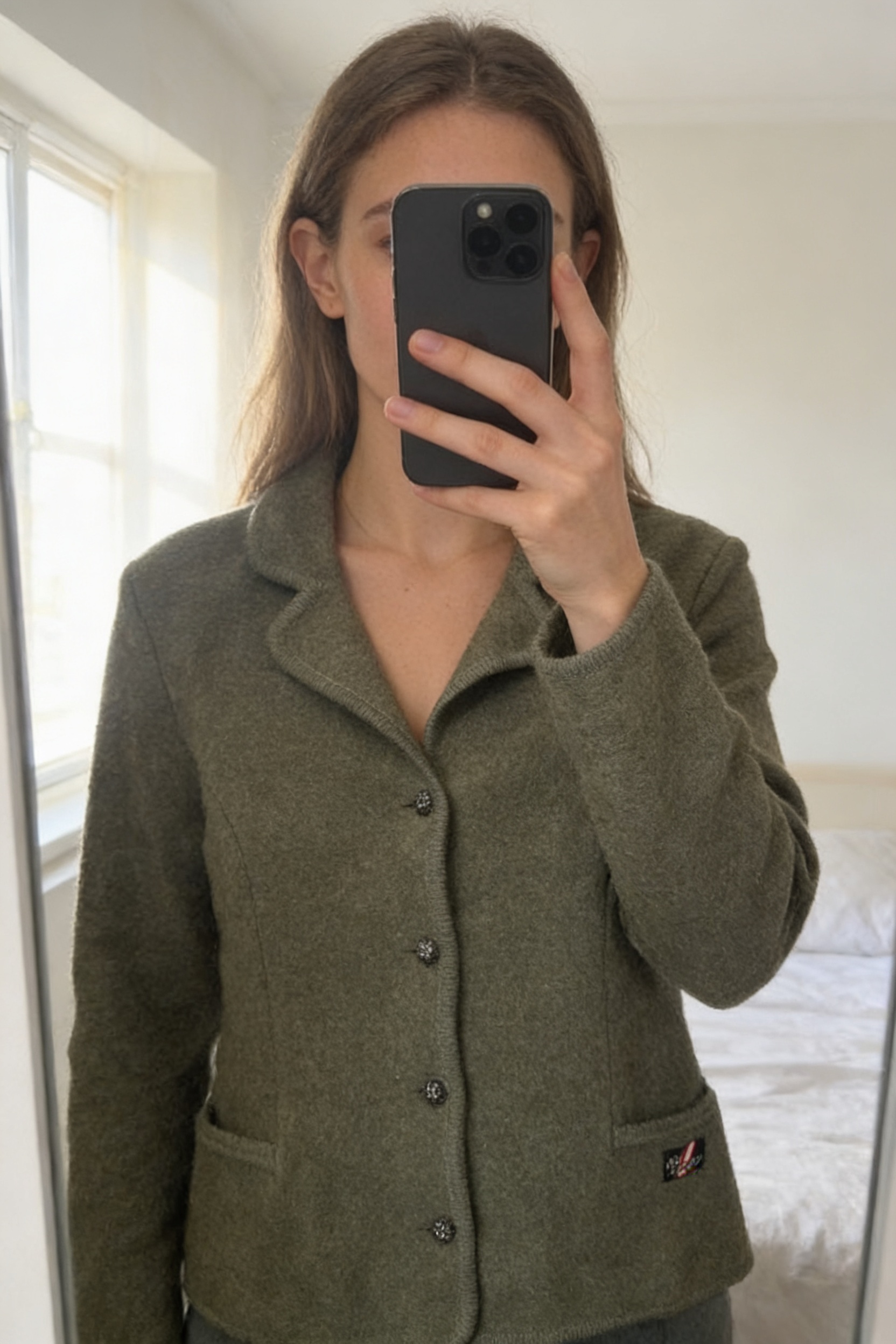 Veste Blazer Fait Main Tricot Made in Autriche 100% Laine Vert Aran Craft L debout, face à la caméra, dans une chambre à la lumière douce, avec une lumière naturelle filtrant par la fenêtre.