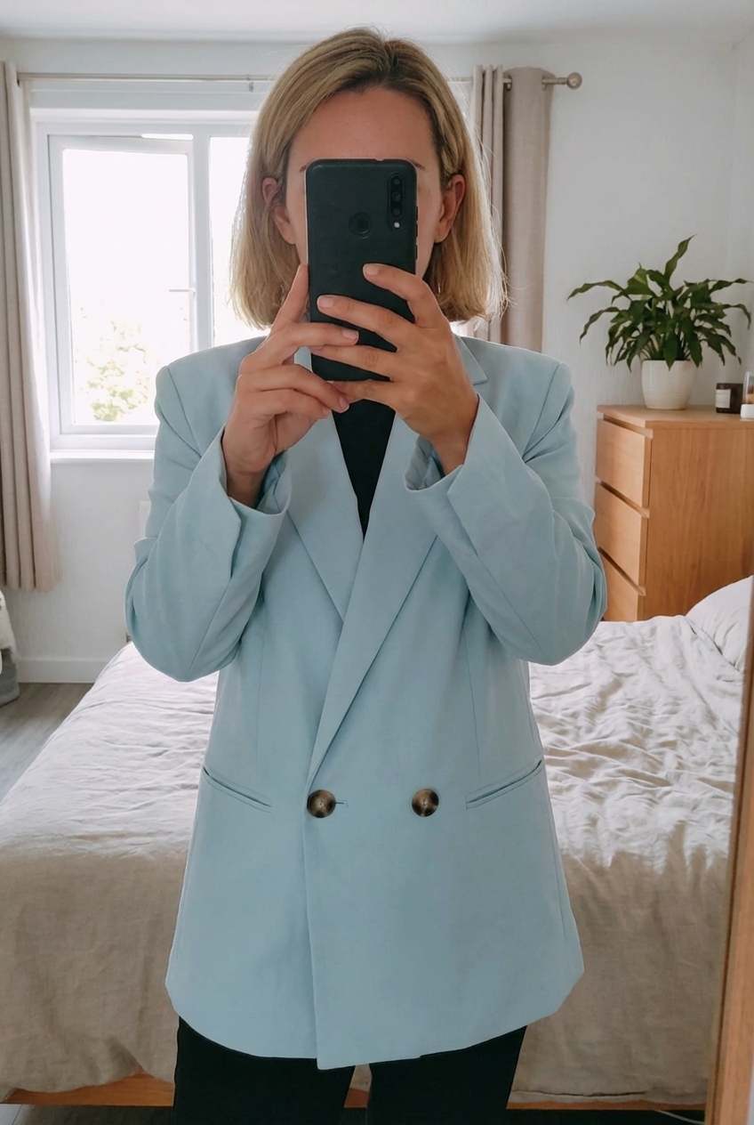 Veste blazer H&M bleu ciel debout, face à la caméra, dans une chambre à la lumière douce, avec une lumière naturelle filtrant par la fenêtre.