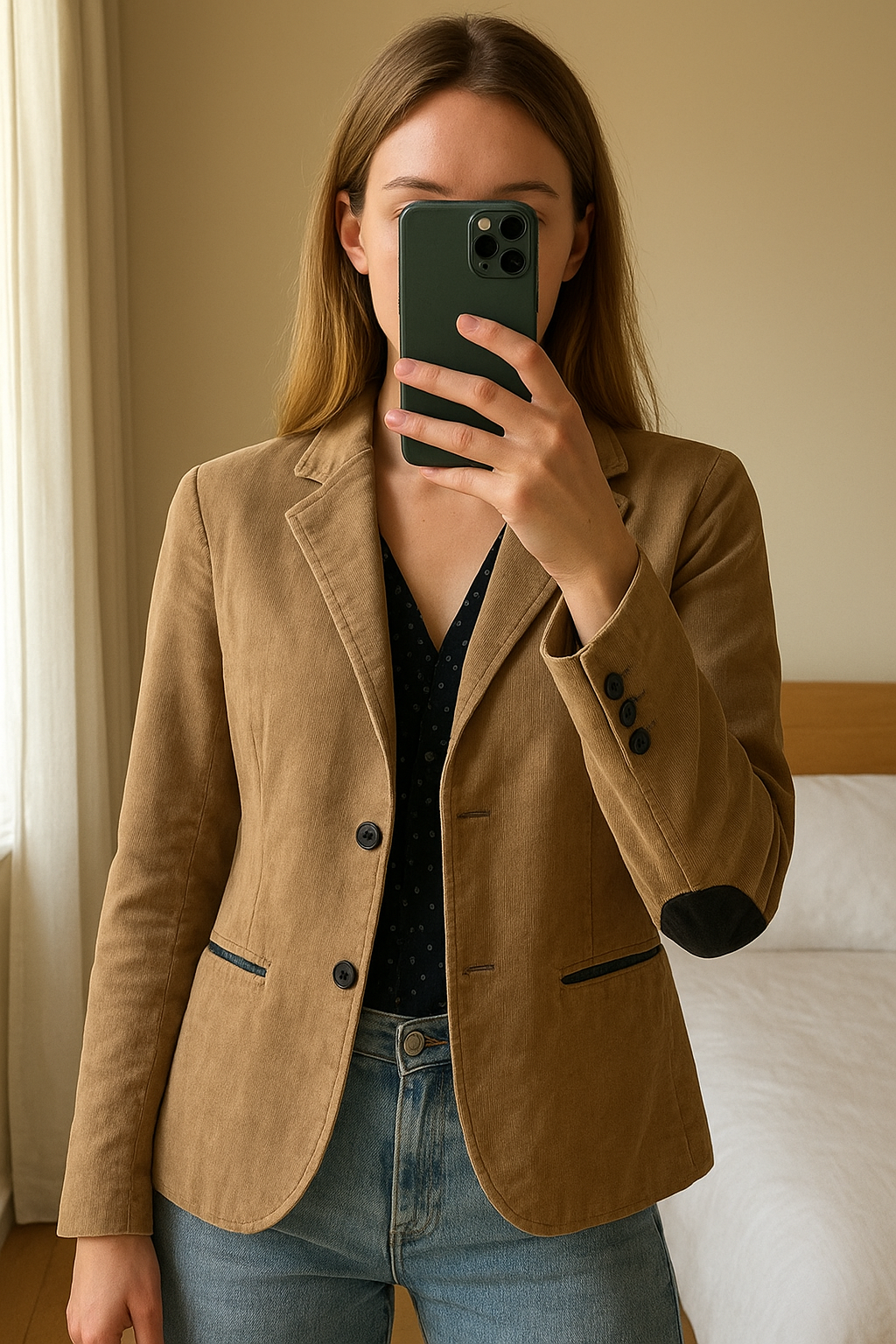 Veste blazer velours marron clair Bonobo – Taille XS debout, face à la caméra, dans une chambre à la lumière douce, avec une lumière naturelle filtrant par la fenêtre.