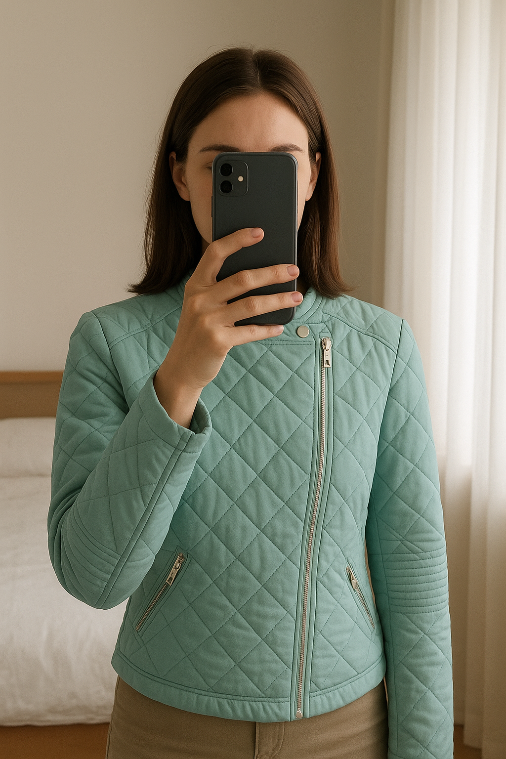 Veste bleue Only🍃 debout, face à la caméra, dans une chambre à la lumière douce, avec une lumière naturelle filtrant par la fenêtre.