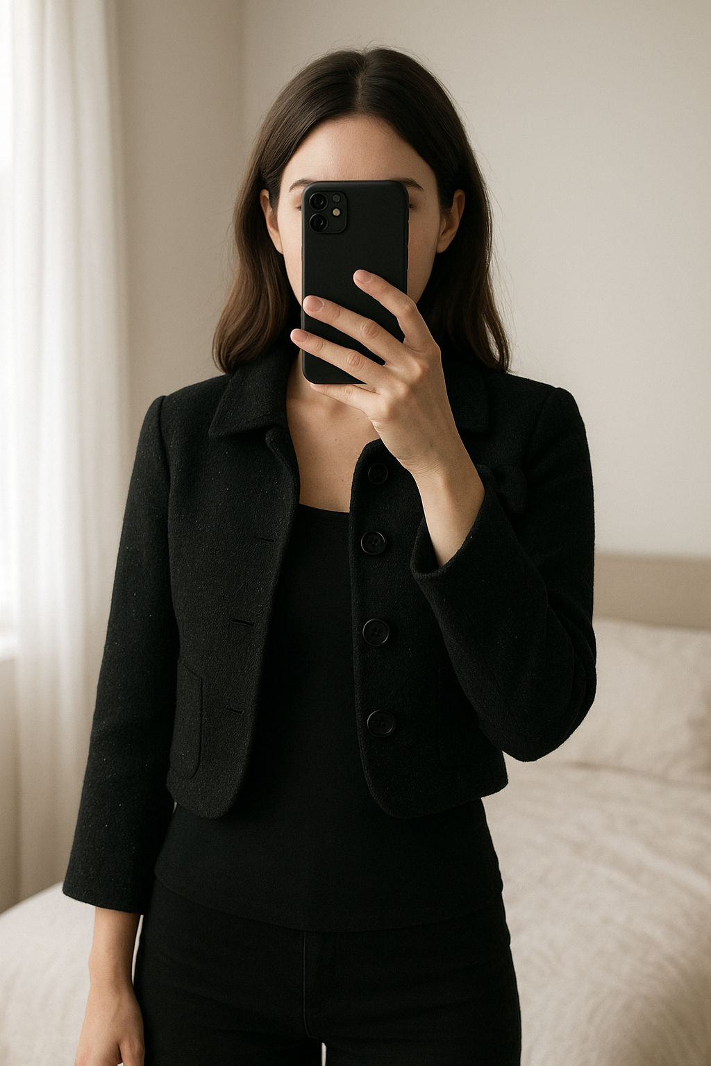 Veste boléro debout, face à la caméra, dans une chambre à la lumière douce, avec une lumière naturelle filtrant par la fenêtre.