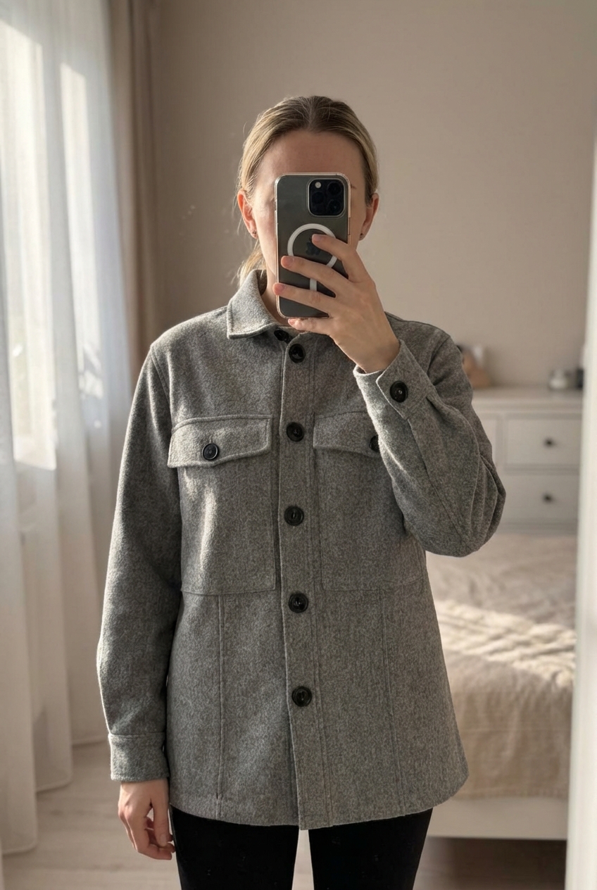 Veste caban grise Taille S / M Très bonne état debout, face à la caméra, dans une chambre à la lumière douce, avec une lumière naturelle filtrant par la fenêtre.