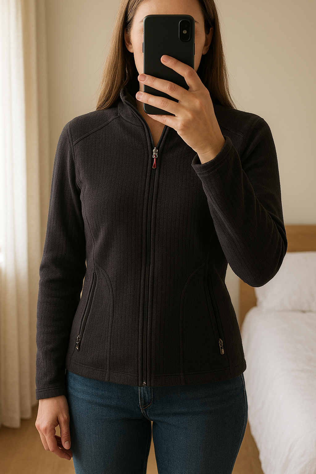 Veste à capuche debout, face à la caméra, dans une chambre à la lumière douce, avec une lumière naturelle filtrant par la fenêtre.