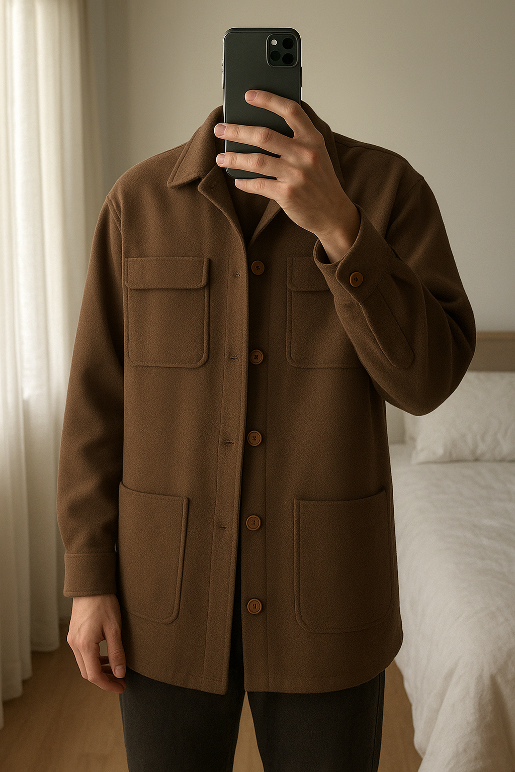 Veste chemise debout, face à la caméra, dans une chambre à la lumière douce, avec une lumière naturelle filtrant par la fenêtre.