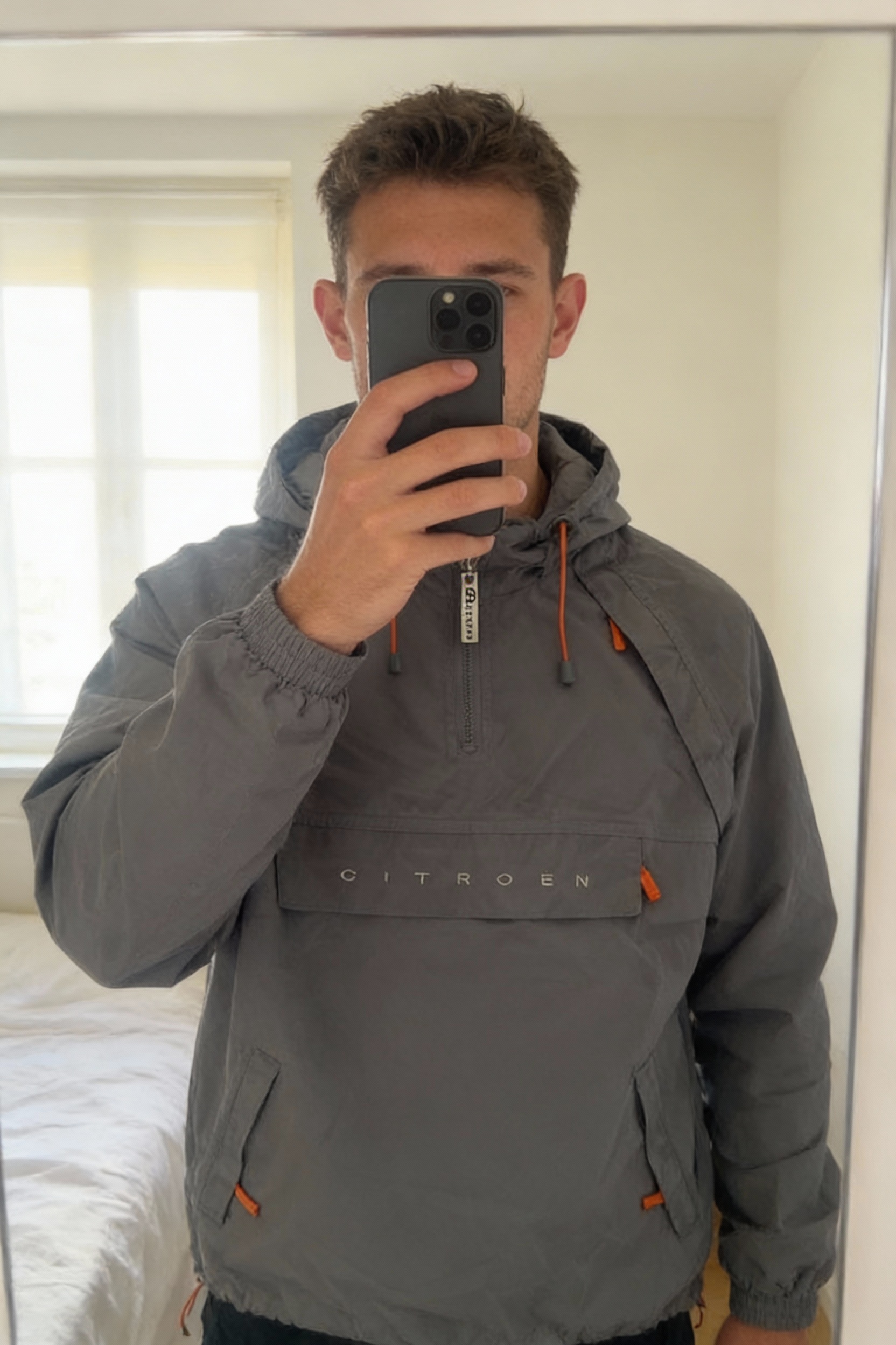 Veste Coupe-Vent Barents Legend Citroën Gris Orange debout, face à la caméra, dans une chambre à la lumière douce, avec une lumière naturelle filtrant par la fenêtre.