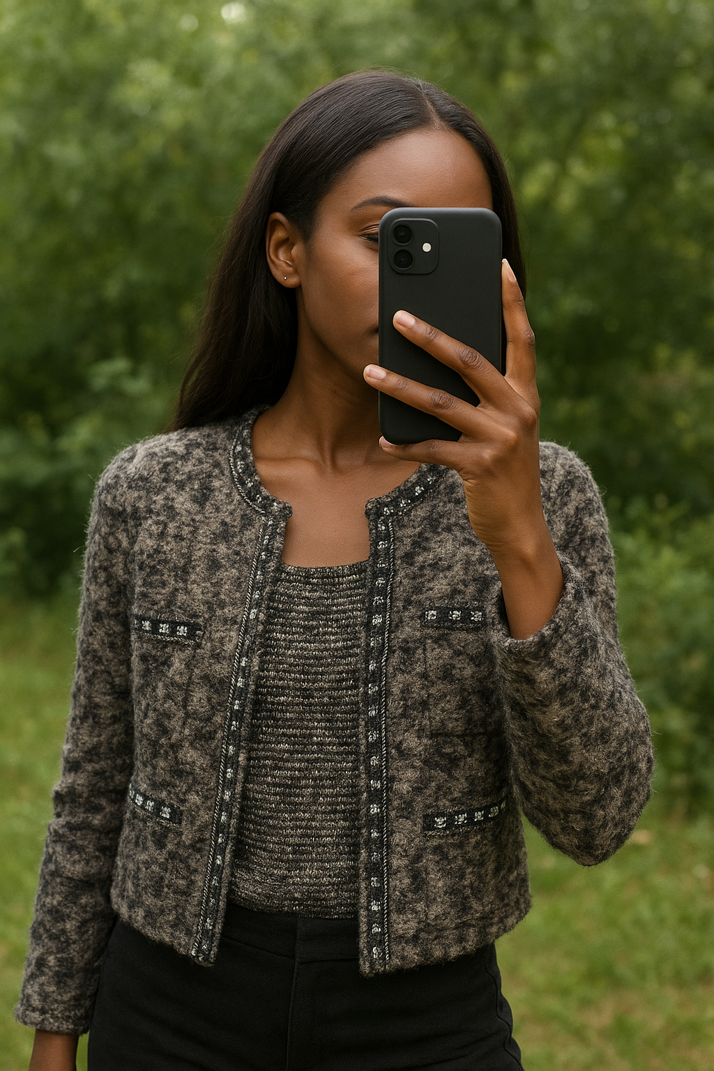 Une personne en Veste d’hiver ZARA - Chiné noir et beige - Taille S cambrant légèrement le dos pour une pose dynamique, avec une silhouette fine, en extérieur, dans un cadre naturel entouré de verdure et de lumière douce.