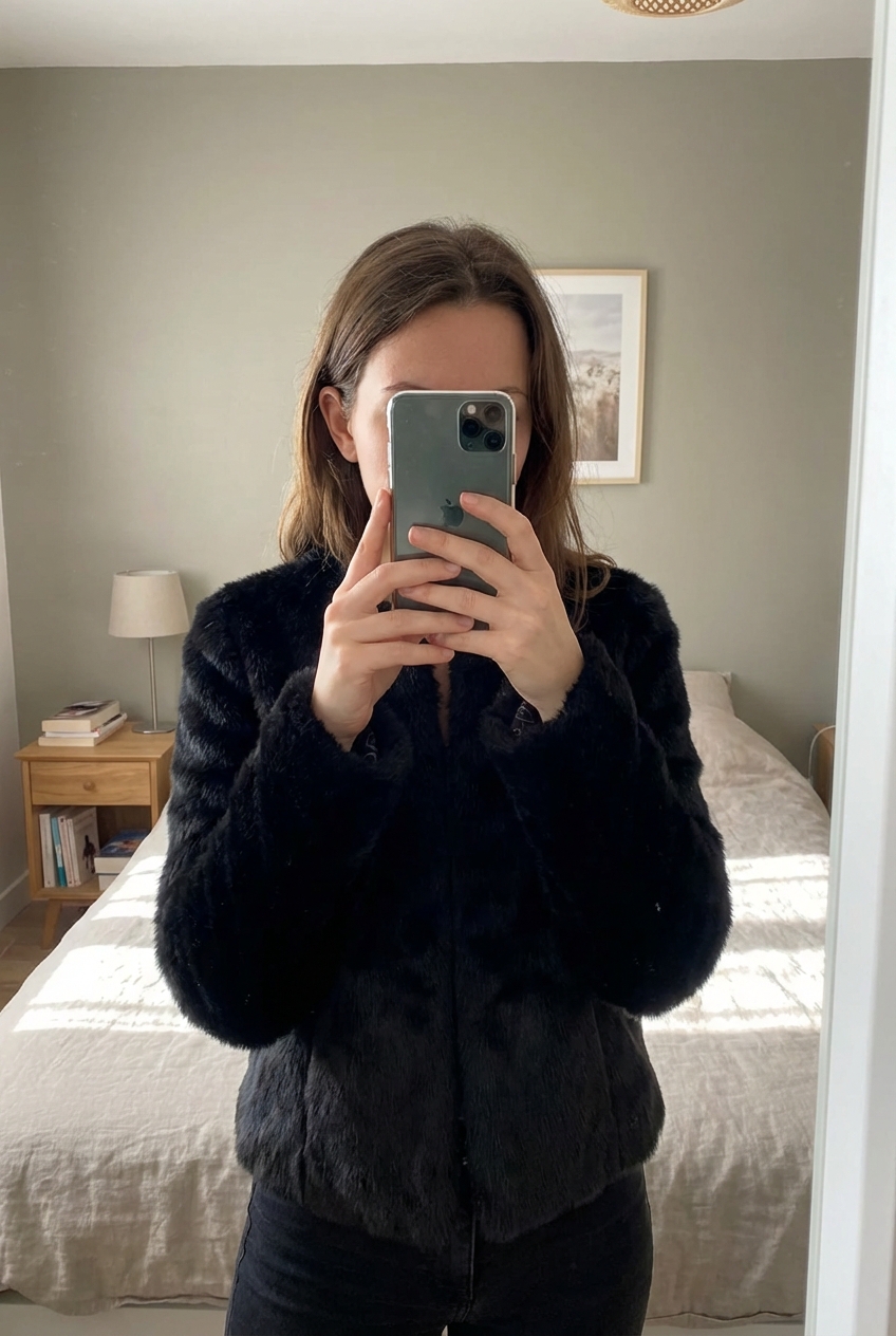 Veste en fausse fourrure noir debout, face à la caméra, dans une chambre à la lumière douce, avec une lumière naturelle filtrant par la fenêtre.