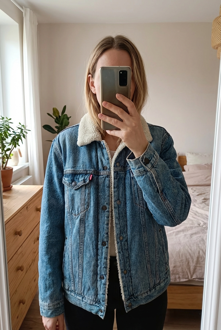 Veste en jean Levi's XL debout, face à la caméra, dans une chambre à la lumière douce, avec une lumière naturelle filtrant par la fenêtre.