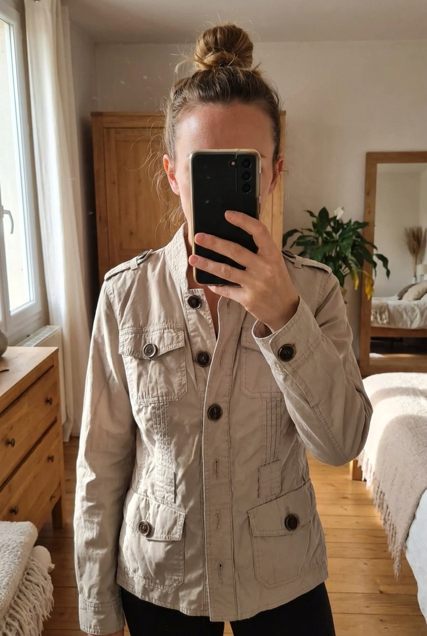 Veste Esprit beige debout, face à la caméra, dans une chambre à la lumière douce, avec une lumière naturelle filtrant par la fenêtre.