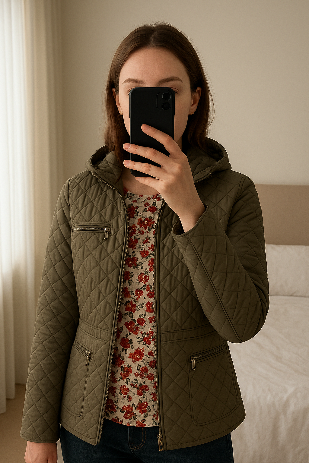 Veste femme debout, face à la caméra, dans une chambre à la lumière douce, avec une lumière naturelle filtrant par la fenêtre.