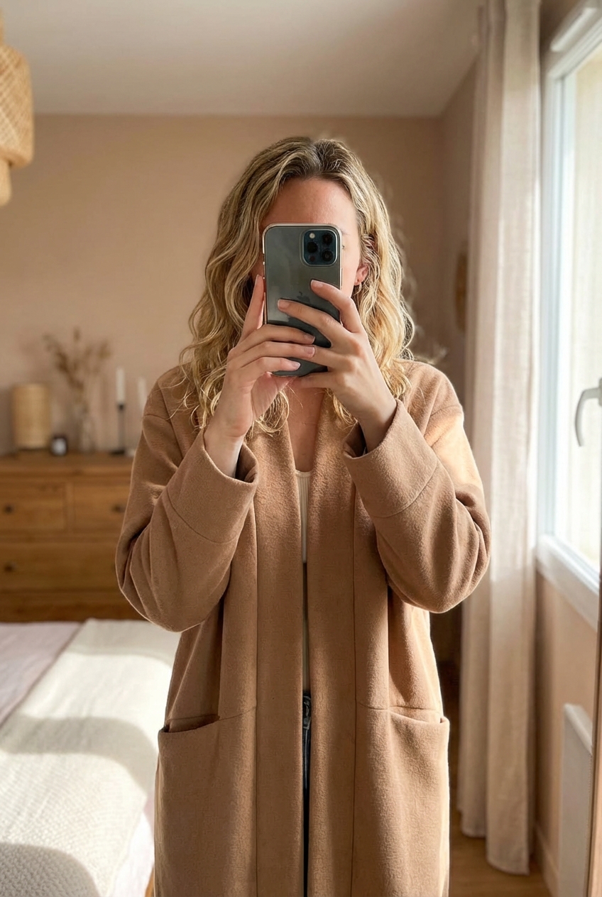 Veste femme debout, face à la caméra, dans une chambre à la lumière douce, avec une lumière naturelle filtrant par la fenêtre.