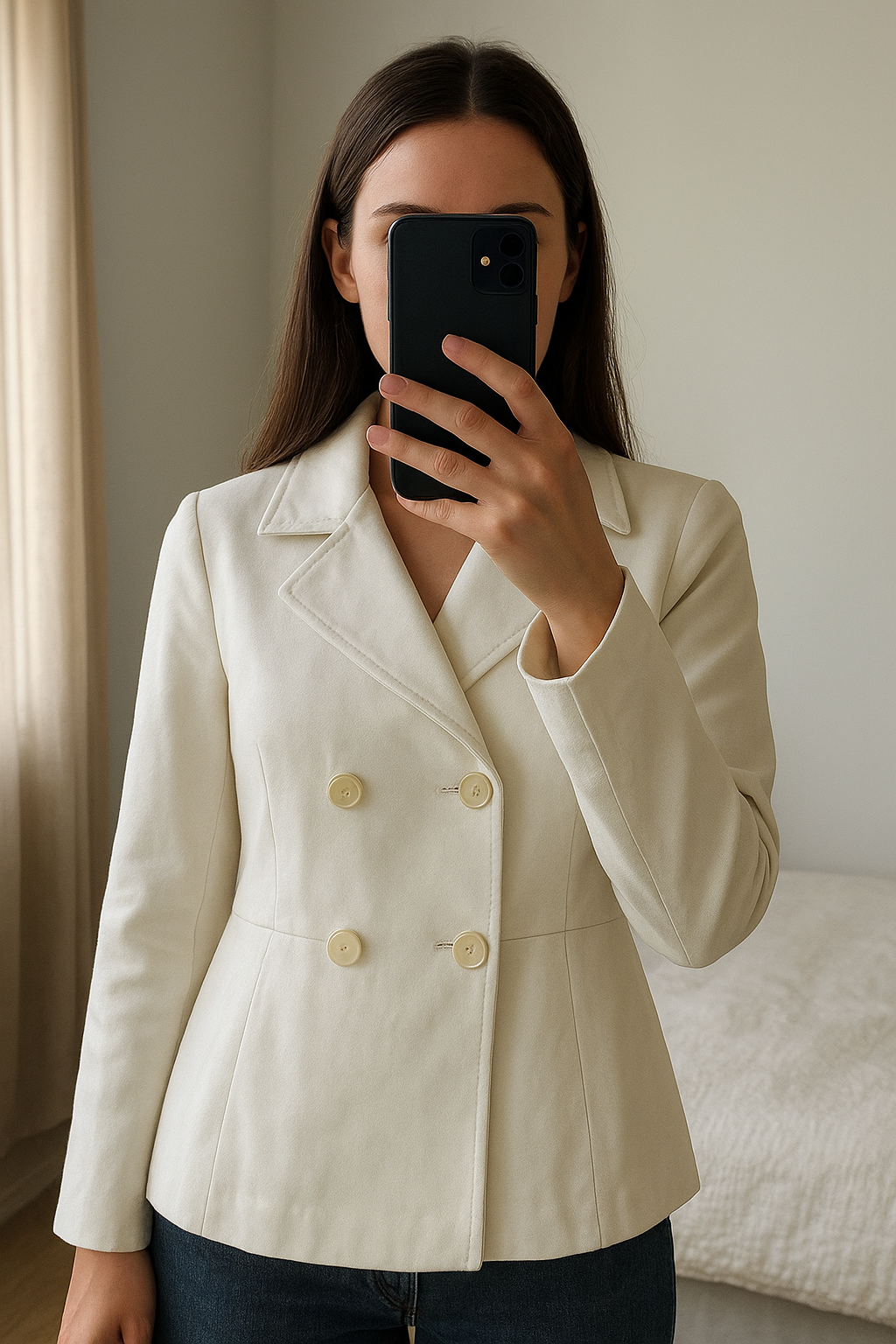 Veste forme baby debout, face à la caméra, dans une chambre à la lumière douce, avec une lumière naturelle filtrant par la fenêtre.