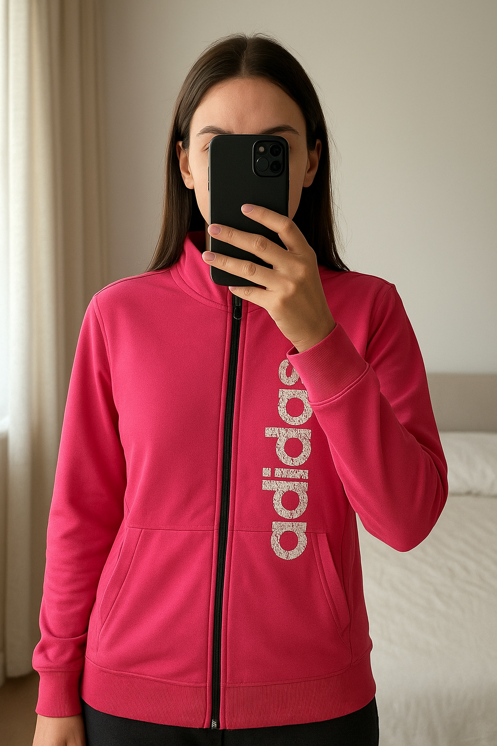 Veste jogging debout, face à la caméra, dans une chambre à la lumière douce, avec une lumière naturelle filtrant par la fenêtre.