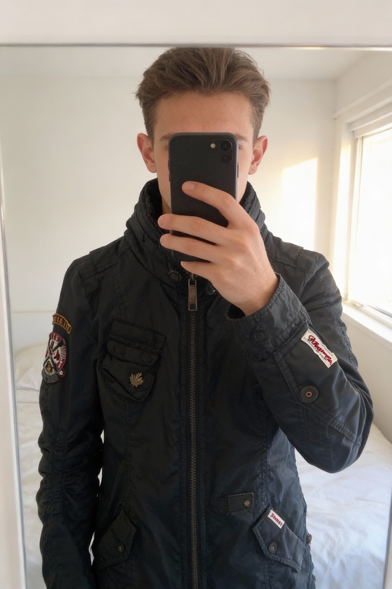 Veste Khujo Cosma M neuve noire debout, face à la caméra, dans une chambre à la lumière douce, avec une lumière naturelle filtrant par la fenêtre.