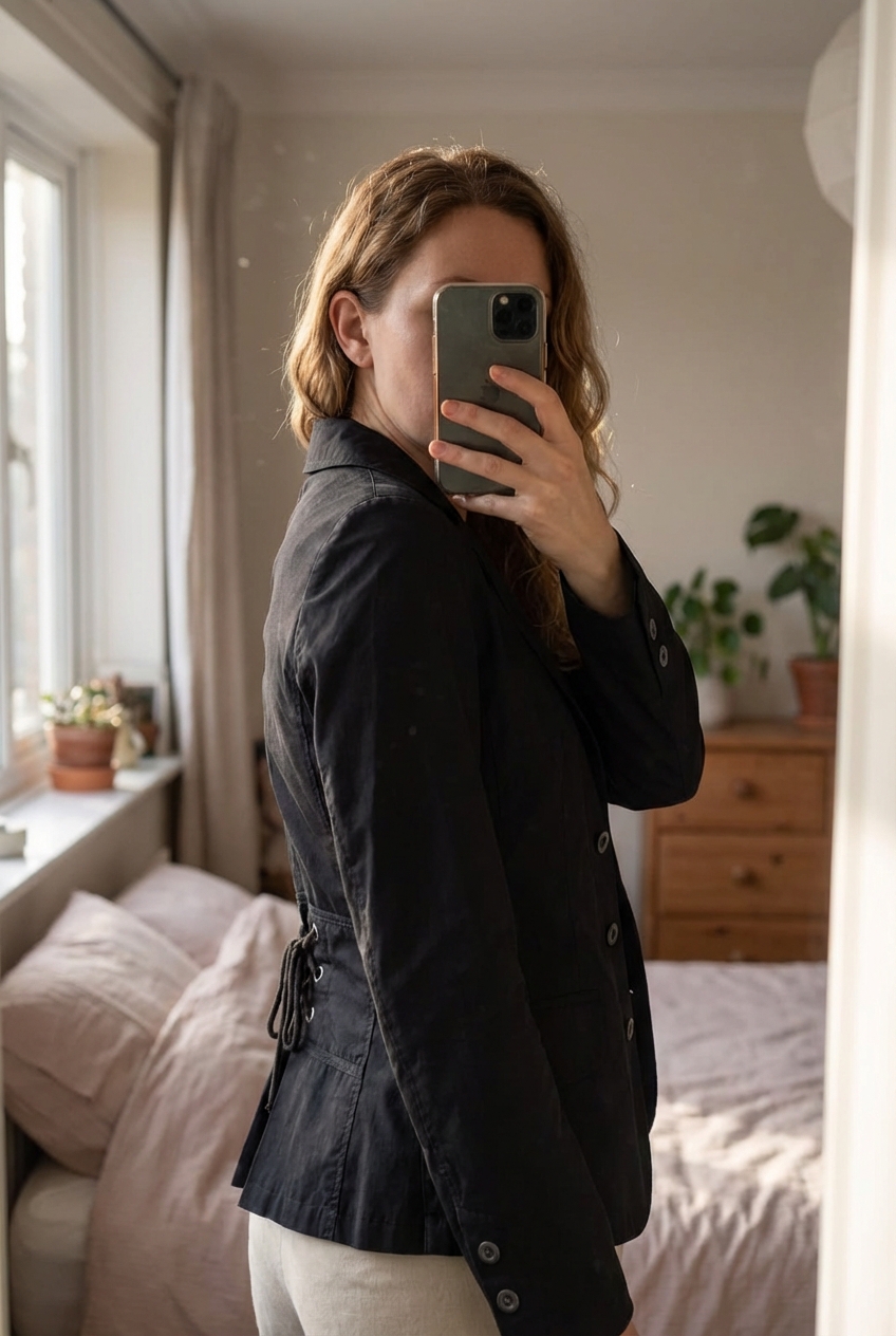 Veste légère Mexx debout, face à la caméra, dans une chambre à la lumière douce, avec une lumière naturelle filtrant par la fenêtre.