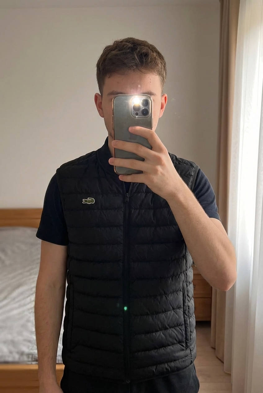 Veste Lacoste sans manches noire – Taille M debout, face à la caméra, dans une chambre à la lumière douce, avec une lumière naturelle filtrant par la fenêtre.