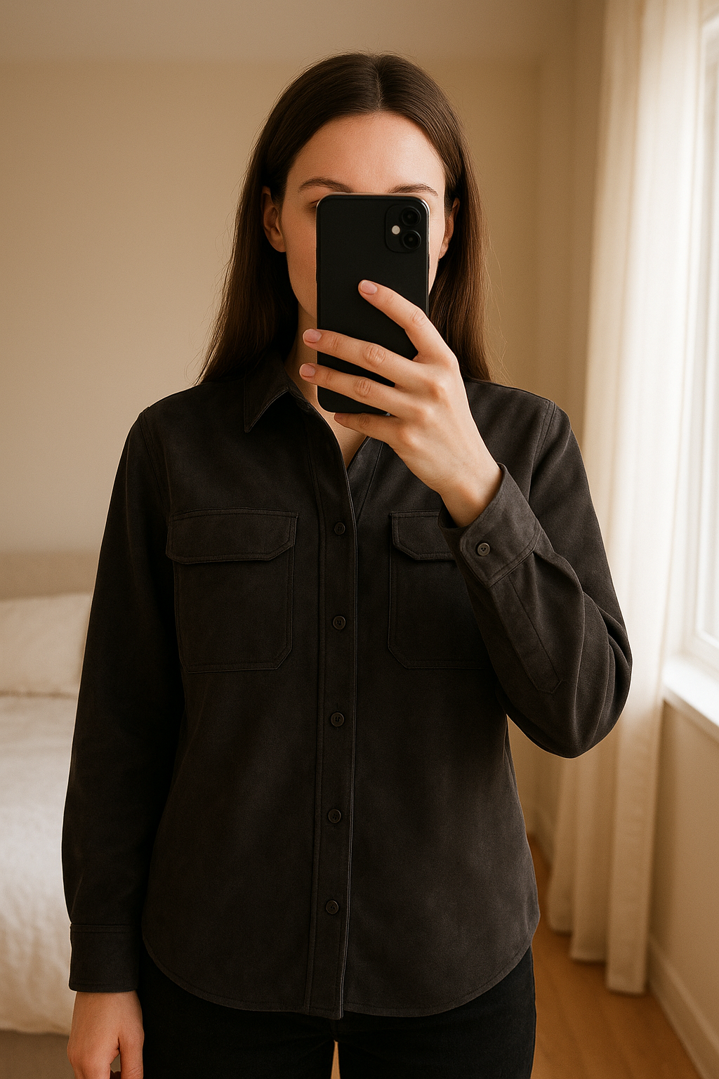 Veste longue brune debout, face à la caméra, dans une chambre à la lumière douce, avec une lumière naturelle filtrant par la fenêtre.