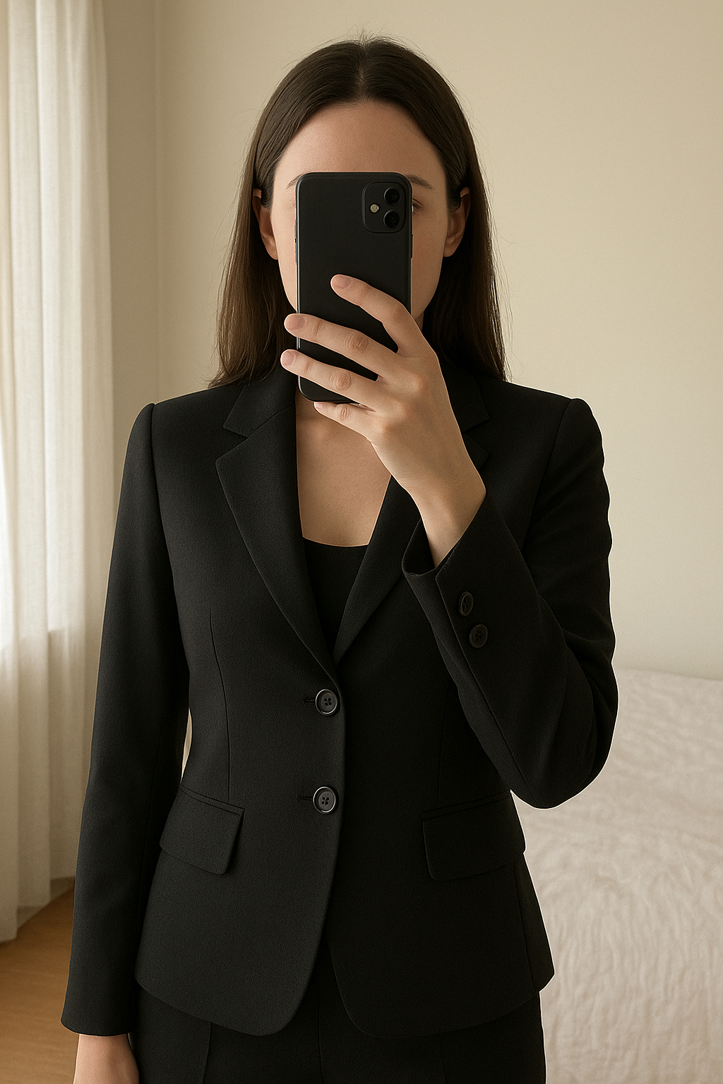 Veste noire Kokaï Taille 36 debout, face à la caméra, dans une chambre à la lumière douce, avec une lumière naturelle filtrant par la fenêtre.