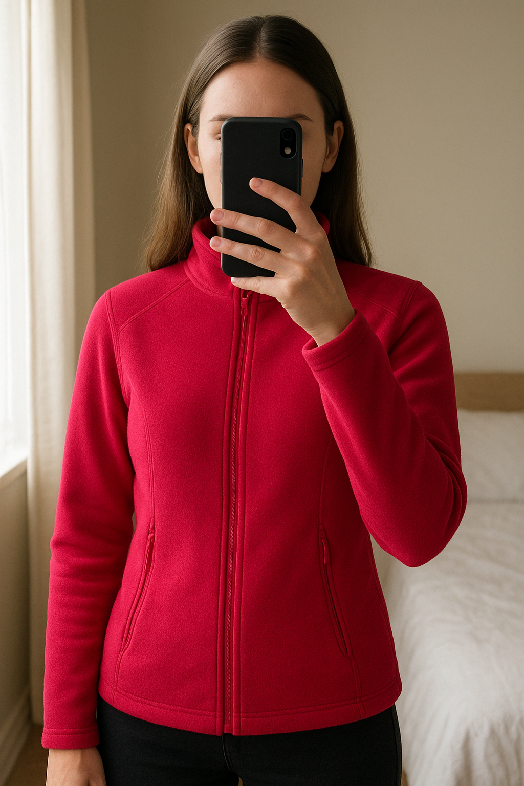 Veste polaire debout, face à la caméra, dans une chambre à la lumière douce, avec une lumière naturelle filtrant par la fenêtre.