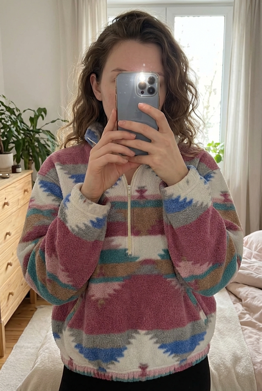Une personne en Veste Polaire Crazy Fleece Vintage Y2K Norway patern Rose S Oversize debout, face à la caméra, dans une chambre à la lumière douce, avec une lumière naturelle filtrant par la fenêtre.